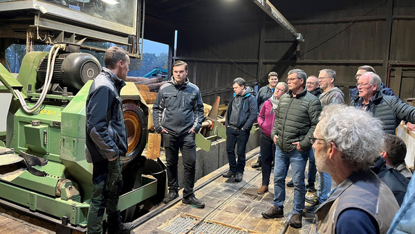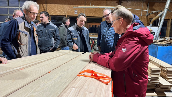 Zu Beginn informierten Kevin und Paul Hagedorn die Teilnehmenden über die über 60-jährige Geschichte des Familienunternehmens und gaben anschließend spannende Einblicke in die einzelnen Produktionsschritte des Sägewerks. Vom Rundholz- und Schnittholzlager über die Besichtigung der Trockenkammer bis hin zur Fertigung von Massivholzdielen und Holzbriketts konnten sich die Innungsmitglieder ein umfassendes Bild der modernen Holzbearbeitung machen.